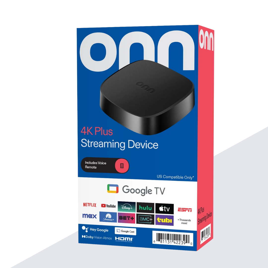 Experience fast and powerful streaming with the onn Google TV 4K Plus Streaming Device, delivering premium entertainment at an exceptional value. Easily transform your TV into a cinematic experience, showcasing your favorite entertainment in vibrant 4K Ultra HD resolution. Enjoy smooth, lag-free performance with 2GB of RAM, making navigation and multitasking a breeze. Get double the storage compared to the standard onn 4K, with 16GB of storage to provide more space to download more apps, games, and content. Stay connected with blazing-fast Wi-Fi 6 (2.4/5GHz 802.11ax) or a USB-C hub with Ethernet port connection. Immerse yourself in breathtaking visuals powered by Dolby Vision and rich, multidimensional audio thanks to Dolby Atmos technology. Effortlessly browse and discover content with Google TV, bringing all your streaming services together in one seamless and intuitive interface. Unlock a universe of over 700,000 movies and shows, plus 10,000+ apps, including Netflix, YouTube, Disney+, and a staggering 800+ free live TV channels. Finding what you want is a breeze with the voice remote featuring Google Assistant – simply speak to search for shows, control your TV, and get instant answers. The onn 4K Plus connects easily via HDMI and is powered by the included AC adapter. Setup is quick and easy with everything you need included in the box: the 4K Plus Streaming Device, remote (2 AAA batteries included), HDMI cable (3.28ft), AC adapter, adhesive tape, and Quick Start Guide. This device is for use within the USA & Puerto Rico only. Some apps, content, and/or features may not be available in all countries. Subject to availability. Subscription, download, or purchase may be required for viewing.
